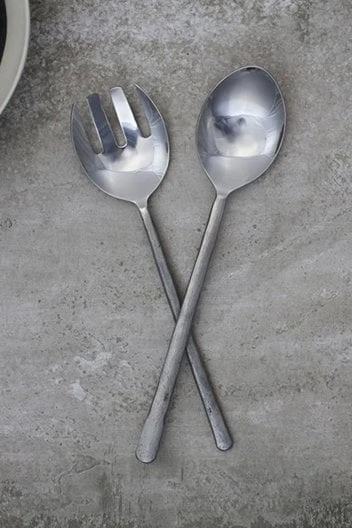 Nkuku Sirkali Brushed silver Salad servers Handmade Hand-forged handles with a textured finish Stainless steel Gift boxed Product Code: 31627 An elegant addition to the dinner table, the Nkuku Sirkali Brushed Silver Salad Servers are full of character and charm. Featuring a fork and spoon, this set of handmade salad servers feature a hand-forged handle with its striking textured finish that wraps around sturdy stainless steel for a durable finish. Coming in a gift box for easy storage, they also make a thoughtful gift for those who love to cook and entertain.