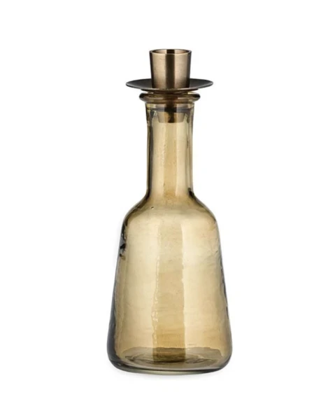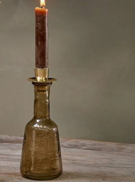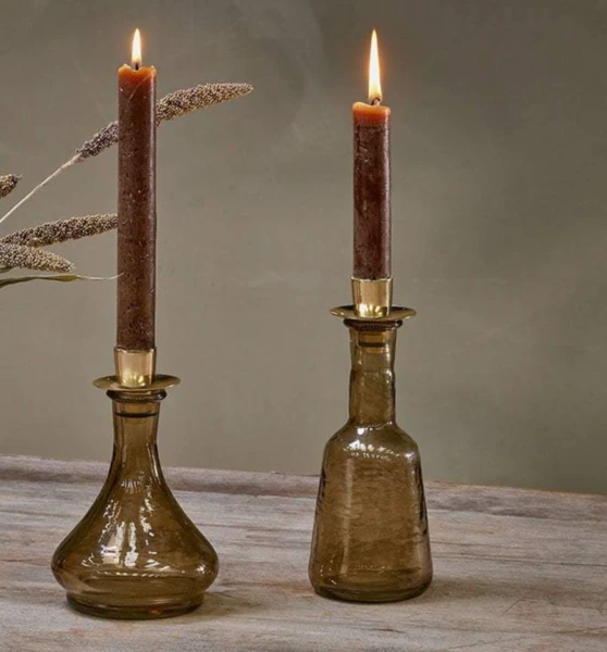 This elegant glass candlestick has a sophisticated sepia colour tone. The simple tapered shape is topped with a removable ‘antique’ brass candle holder that fits a standard dining table candle. The flexibility of removing the holder means that it can also be used as a pretty stem vase. We recommend mixing and matching a few sizes and shapes in the Sirsa collection for an attractive display. Dimensions: 17cm x 7.5cm x 7.5cm Material: glass and iron Care: hand wash only