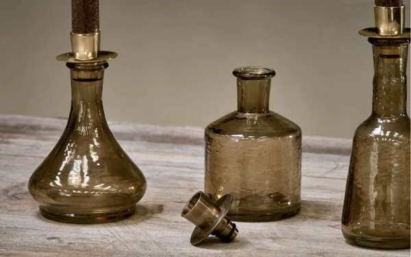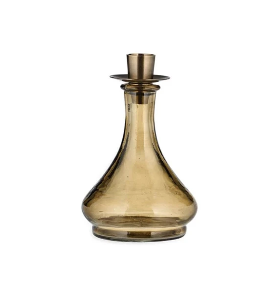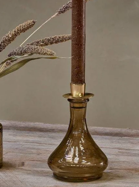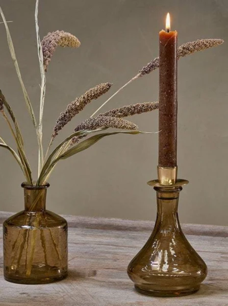 This elegant glass candlestick has a sophisticated sepia colour tone. The simple tapered shape is topped with a removable ‘antique’ brass candle holder that fits a standard dining table candle. The flexibility of removing the holder means that it can also be used as a pretty stem vase. We recommend mixing and matching a few sizes and shapes in the Sirsa collection for an attractive display. Dimensions: 13cm x 10cm x 10cm Material: glass and iron Care: hand wash only