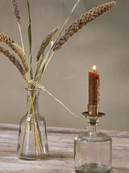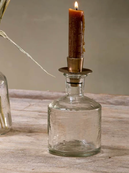 This elegant glass candlestick has an elegant, timeless clear glass finish. The simple tapered shape is topped with a removable ‘antique’ brass candle holder that fits a standard dining table candle. The flexibility of removing the holder means that it can also be used as a pretty stem vase. We recommend mixing and matching a few sizes and shapes in the Sirsa collection for an attractive display. Dimensions: 13cm x 8cm x 8cm Material: glass and iron Care: hand wash only