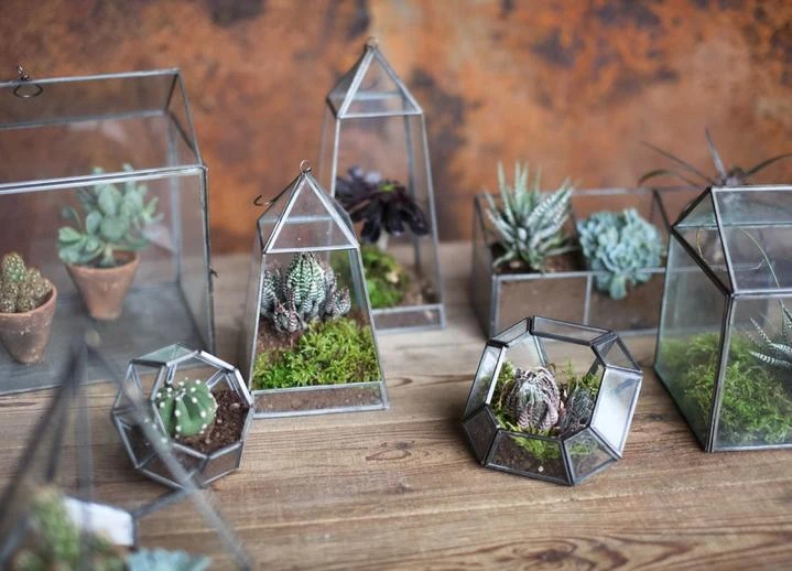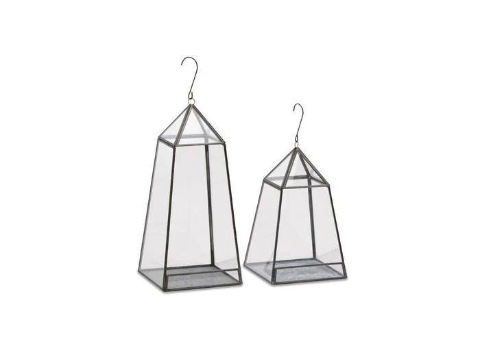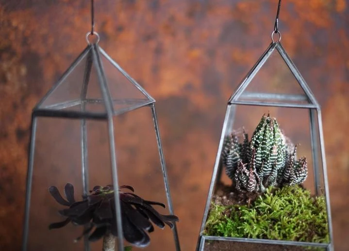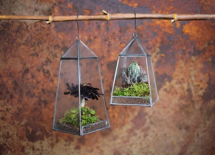 Create an indoor garden with these beautiful zinc and glass terrariums. These gorgeous hanging terrariums can be used for planting succulents or displaying tealights. They look beautiful both indoors and outdoors. Choose from a tall or short terrarium.