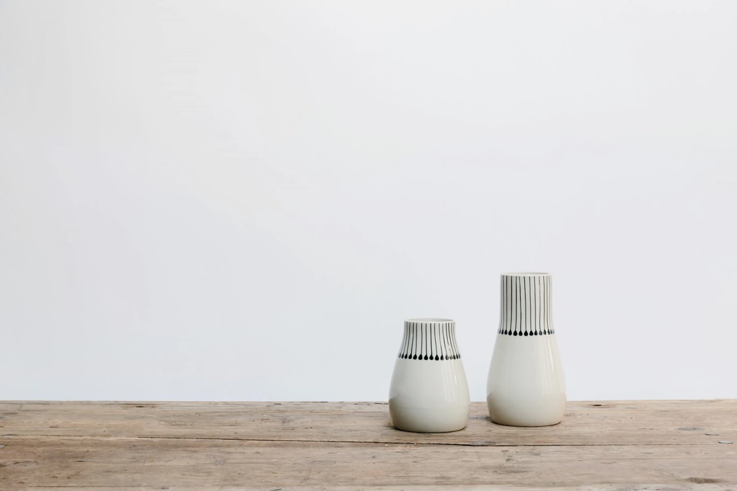 A white ceramic vase, hand painted with a black “matchstick” pattern. Ideal for small bunches of wild flowers and foliage, or large single stems.