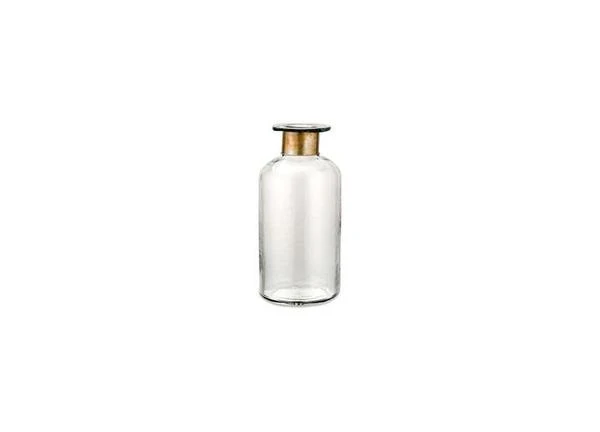 Large enough to use as a striking vase that will not call attention away from any floral arrangement. These artisan made bottles involve hammering glass with traditional tools providing this subtle textured effect. The glass is skilfully blown through the glass ring creating this elegant shape. Burn marks are often evident on the brass as a result of this complex making process. Dimensions: 31.5 (height) x 12cm (dia) Clear glass and antique brass