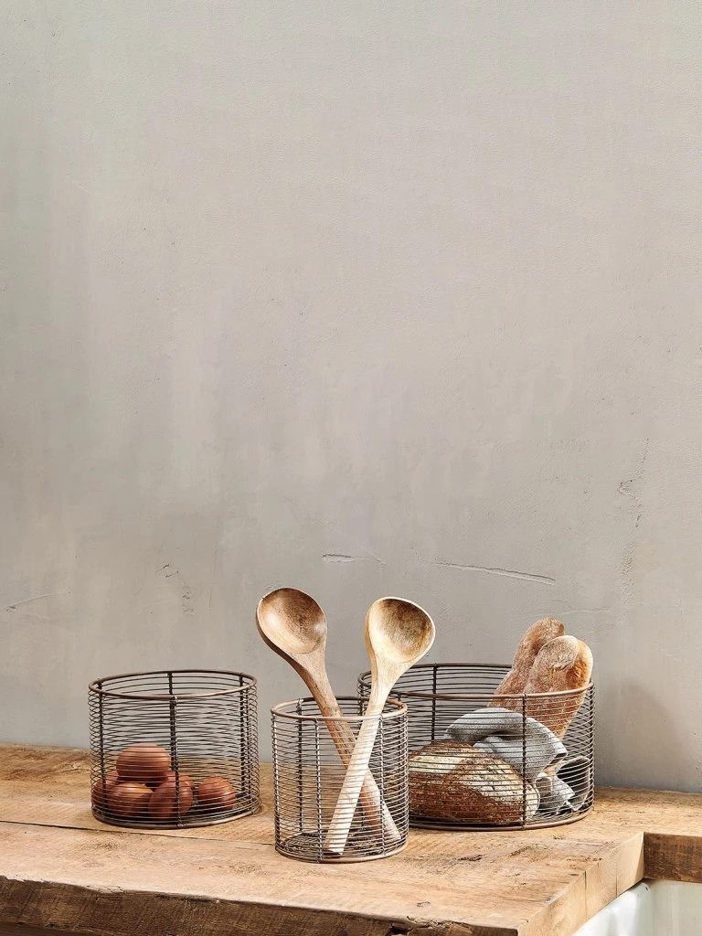 The Inkollu Basket Bowl by Nkuku offers an ideal shape for a variety of storage and display options, from utensils in the smallest size to fruit and vegetables in the larger variations. The baskets are sculptured from wire and finished in a warm aged brass hue. Iron 15 x 14 x 14cm Weight: 0.3kg Food Safe Not Dishwasher Safe