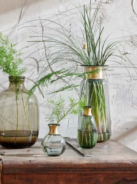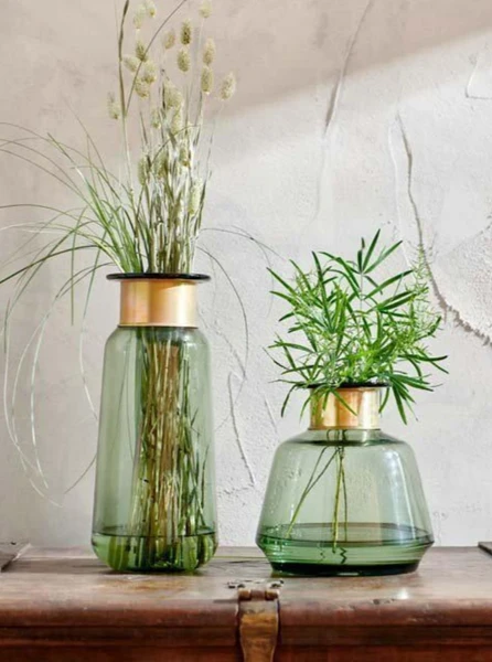 The sophisticated green tones of our Miza coloured glass vases are enhanced by the golden decorative ring at their neck. The coloured glass has a crisp, clean quality. Please Note. The small vase is the vase to the right of image one. Dimensions: 20.5cm x 19cm x 19cm
