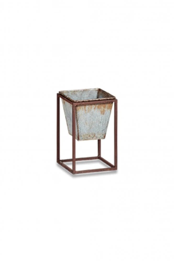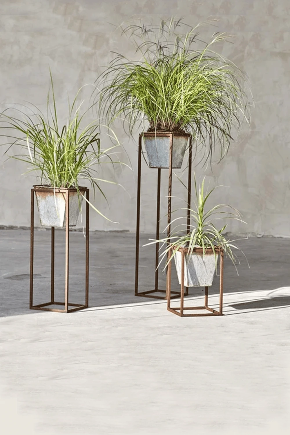 Small: 30 x 17 x17cm A planter such as this Small Narlu Planter Stand by Nkuku is the perfect addition to your home. It has a distressed, rustic finish, that will add a welcome contrast to any greenery. Fill the planter stand with your favourite greenery and think about buying the other sizes in the range, to create an industrial inspired collection inside or outside your home. There is no hole in the base, so if you are using outside you may want to add a hole for drainage. Planter stand Handmade Aged zinc Product code: 39295
