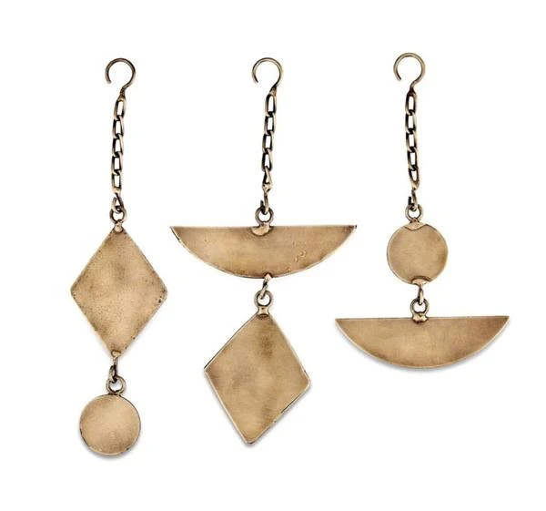 The Tiri Tribal decorations have a unique design, they provide a point of difference to Christmas and can be used all year to dress and decorate an interior. The shapes are hand cut from brass in an interesting combination of shapes. Each decoration is strung on a twisted brass chain. Please note this listing is for the decoration with semi circle and diamond disk only.