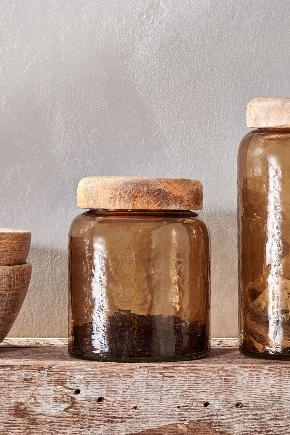 The Charal storage jar is perfect for simple and elegant storage. It’s designed with a sustainable mango wood lid, as well as recycled glass base, and has an all over hammered effect. Each jar includes a seal to ensure the contents remain fresh.