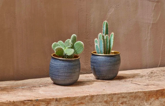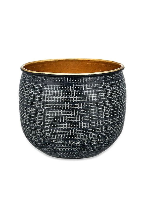 This stylish Tembesi small planter would make a striking windowsill display. The etched pattern is crafted by hand onto the aluminium base. The planters have an eye-catching black exterior and antique brass interior. Not suitable for outdoor use.