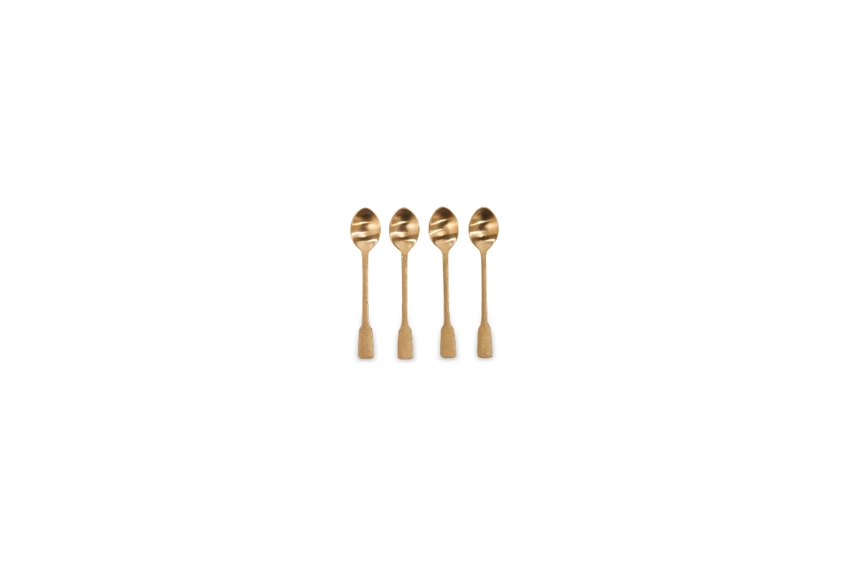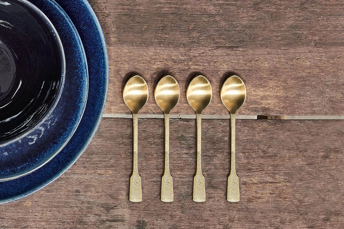 An elegant gift, and a practical accompaniment to our dinner service, these hand forged Veeta teaspoons, have a refined elegance and characterful charm. The stainless steel spoon heads are dressed with tactile, brushed gold handles. The set comes beautifully gift boxed.