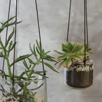 These elegant Viri hanging planters have an eye-catching finish. The organic shape is made from recycled glass. They are perfect for succulents, cacti, herbs and other indoor plants. They come with an adjustable dark leather tie.
