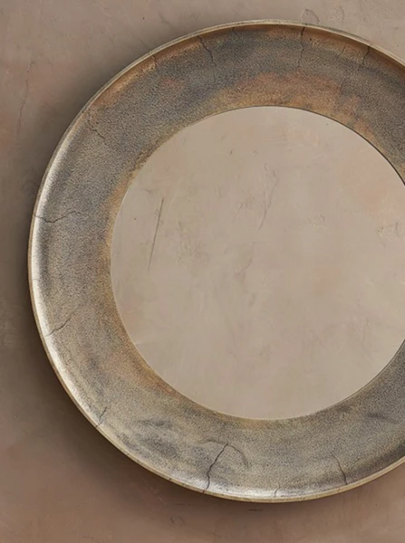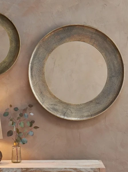 Stylish and beautifully crafted our Yakira mirror makes a striking focal point. The circular design has a deep textured border that celebrates the artisan process. The antique brass finish gives it an attractive antique look. Colour: Antique Brass Dimensions: 88 x 88 x 2cm Material: Aluminium, Glass Mirror