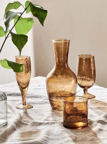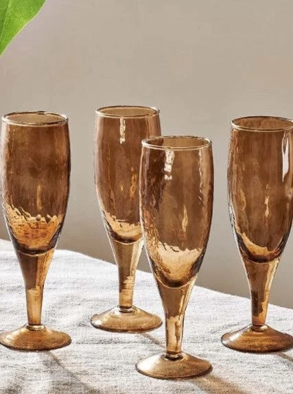 Add a touch of panache to any celebration with our Yala champagne glasses. The warm, smoke brown hue of the recycled glass and their tactile, hammered finish will bring understated elegance to any evening drinks. Perfect for celebrations or drinks with friends. We use recycled glass to make these collections. Firstly, the waste glass is collected and washed to remove any impurities; it ms then crushed and melted down before being hand blown or placed in moulds to create beautiful new products. Dimensions: 19 x 6 x 6cm Capacity: 200ml Material: Recycled Glass Care: Dishwasher Safe