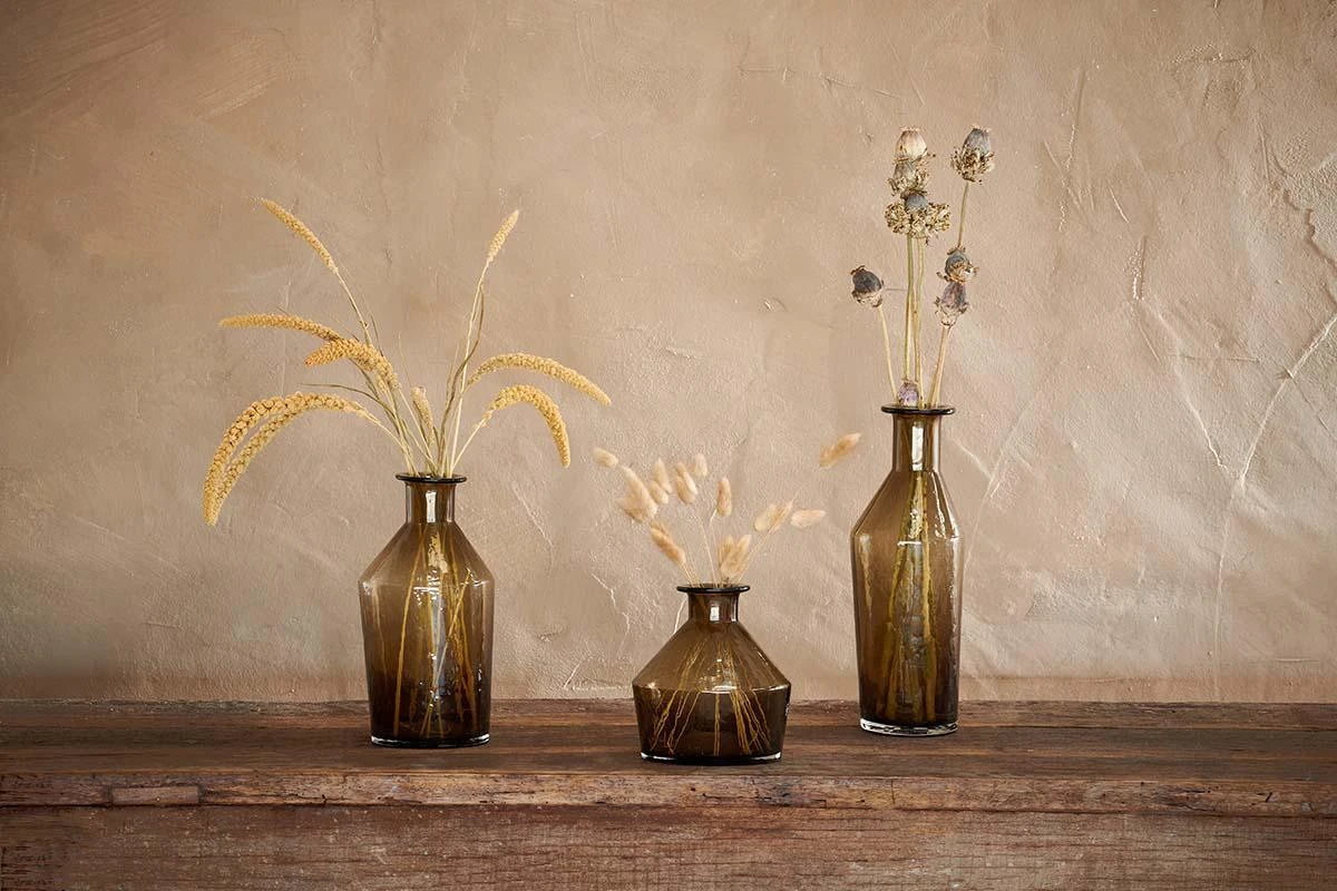 Charming and individual in feel, these attractive Zaani glass vases have asymmetric shape. Handblown into a simple mould, the irregular shape is enhanced with the subtle earthy brown tone. Style different shapes and heights together for an attractive display; fill with dried flowers, foliage or vibrant blooms.