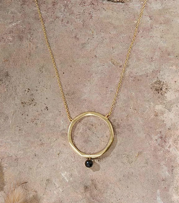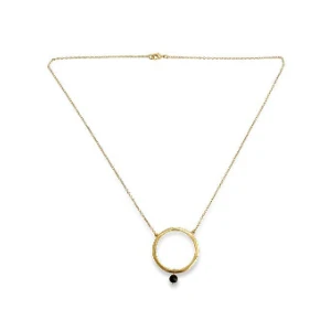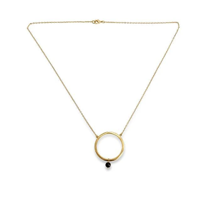 The elegant circular pendant of our Zana necklace has been delicately crafted and adorned with a single piece of Onyx. The jet black natural stone forms a striking contrast against the rich gold ring.