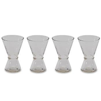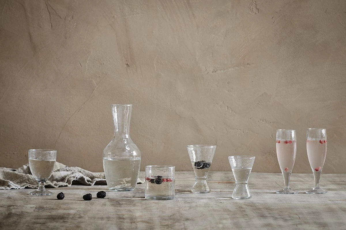 This gift set of small rustic, hand – blown wine glasses is a pleasure to behold. The glasses are hammered when still molten, creating this textured edge that catches the light and adds a tactile quality to each glass. These wine glasses have a unique design, the shape curves in and out in a conical shape.